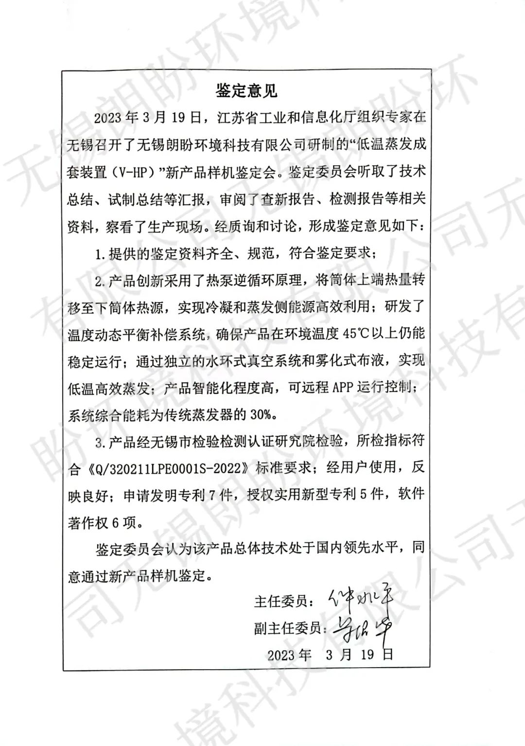 2023年03 月19日,江蘇省工業(yè)和信息化廳組織專家在無錫召開了無錫朗盼環(huán)境科技有限公司研制的“低溫蒸發(fā)成套裝置(V-HP)”、“低溫結(jié)晶成套裝置(V-CT)”新產(chǎn)品新技術(shù)鑒定會(huì)。鑒定委員會(huì)聽取了技術(shù)總結(jié)、試制總結(jié)等匯報(bào),審閱了查新報(bào)告、檢測(cè)報(bào)告等相關(guān)資料,察看了生產(chǎn)現(xiàn)場(chǎng)。