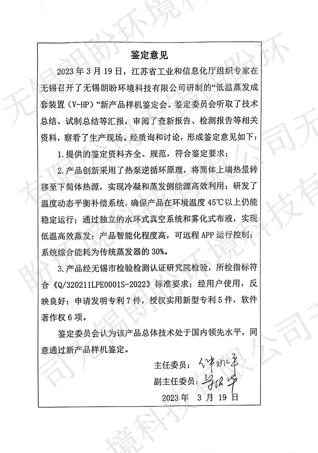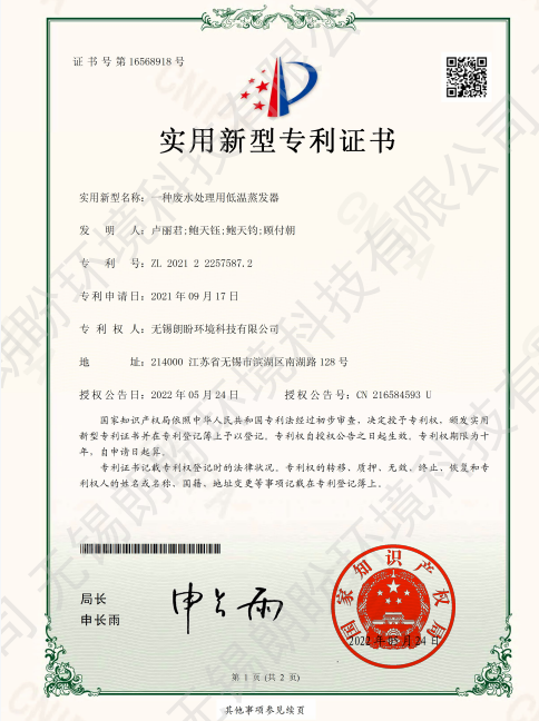 無(wú)錫朗盼環(huán)境科技有限公司是一家集研發(fā)、生產(chǎn)、銷(xiāo)售為一體的高新技術(shù)公司。主要生產(chǎn)低溫?zé)岜谜婵照舭l(fā)器和結(jié)晶器等污水處理設(shè)備、以高濃高鹽廢水蒸發(fā)處理、液態(tài)危險(xiǎn)廢棄物濃縮減量和物料資 源化回收為主營(yíng)業(yè)務(wù),為客戶提供工業(yè)污水零排放低溫蒸發(fā)技術(shù)整 體解決方案。公司積極響應(yīng)國(guó)家號(hào)召,秉承著“綠色環(huán)保,節(jié)能 減排”的企業(yè)愿景,全力推動(dòng)企業(yè)向科技創(chuàng)新、品牌創(chuàng)新的方向發(fā)展 是國(guó)內(nèi)第一家研發(fā)、制造低溫熱泵蒸發(fā)器、第一個(gè)申請(qǐng)發(fā)明專利的廠 家。并取得多項(xiàng)國(guó)家發(fā)明、實(shí)用專利及軟著證書(shū)40余項(xiàng)及江蘇省工業(yè)與信息化廳新技術(shù)新產(chǎn)品認(rèn)定證書(shū)。