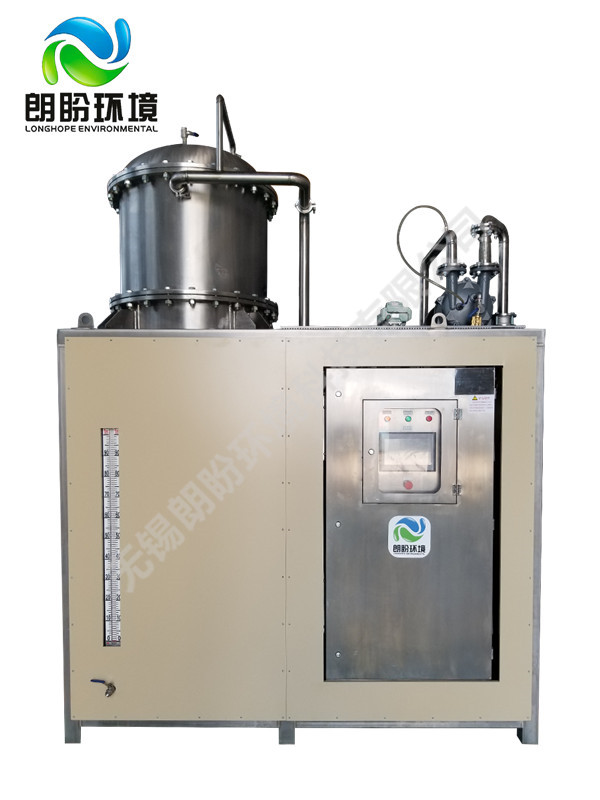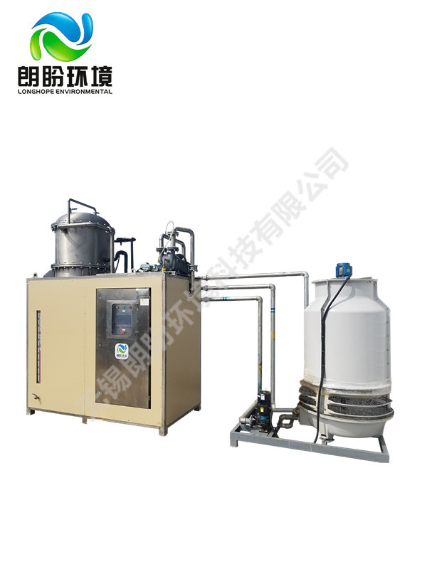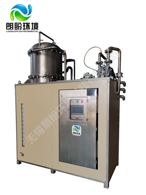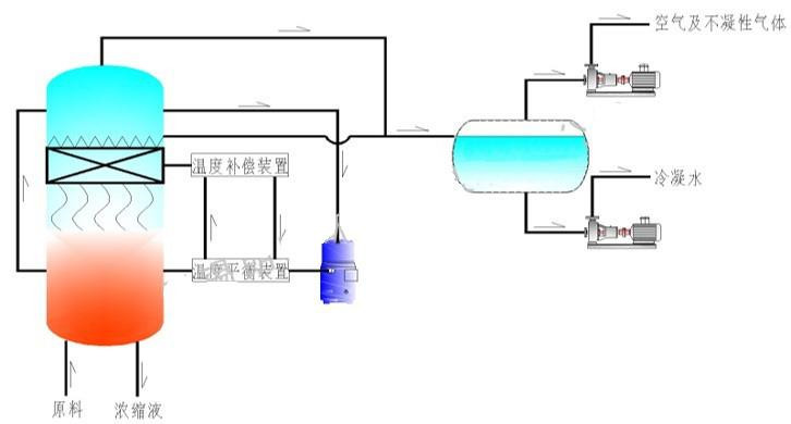 低溫蒸發(fā)結晶器的原理是物料的沸點隨著壓強的降低而降低。低溫節(jié)能濃縮設備整體保持真空狀態(tài),蒸發(fā)室的真空度約為95%~97%,在此壓強下水的沸點為35℃~37℃,系統(tǒng)無需配備進料泵,利用蒸發(fā)室的負壓將物料吸進蒸發(fā)室,通過強制循環(huán)方式將物料循環(huán)霧化,傳輸至換熱器上,物料中水分被蒸發(fā),物料連續(xù)循環(huán)霧化,通過蒸發(fā)室液位自動補料,濃度達到要求后作為濃縮液排出設備。濃縮液一般粘度較大,需采用泵抽出。