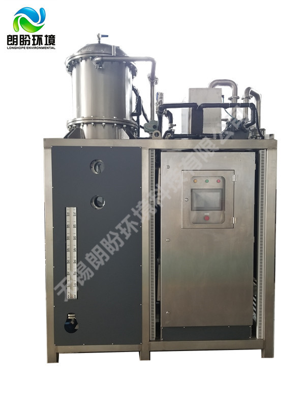 • 低溫萃取濃縮器的原理是物料的沸點隨著壓強的降低而降低。低溫節(jié)能濃縮設(shè)備整體保持真空狀態(tài),濃縮室的真空度約為95%~97%,在此壓強下水的沸點為35℃~37℃,系統(tǒng)無需配備進料泵,利用蒸發(fā)室的負壓將物料吸進蒸發(fā)室,通過強制循環(huán)方式將物料循環(huán)霧化,傳輸至換熱器上,物料中水分被蒸發(fā),物料連續(xù)循環(huán)霧化,通過蒸發(fā)室液位自動補料,濃度達到要求后作為濃縮液排出設(shè)備。濃縮液一般粘度較大,需采用泵抽出。