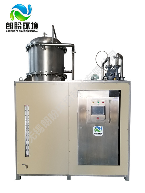 低溫節(jié)能濃縮設備的原理是物料的沸點隨著壓強的降低而降低。低溫節(jié)能濃縮設備整體保持真空狀態(tài),濃縮室的真空度約為95%~97%,在此壓強下水的沸點為35℃~37℃,系統(tǒng)無需配備進料泵,利用蒸發(fā)室的負壓將物料吸進蒸發(fā)室,通過強制循環(huán)方式將物料循環(huán)霧化,傳輸至換熱器上,物料中水分被蒸發(fā),物料連續(xù)循環(huán)霧化,通過蒸發(fā)室液位自動補料,濃度達到要求后作為濃縮液排出設備。濃縮液一般粘度較大,需采用泵抽出。